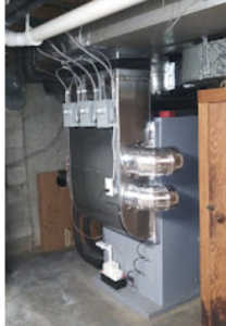 Two years ago, we had our oil-burning furnace, its oil tank, and our air conditioner all removed. In their place, we now have one geothermal unit that warms our air during the winter and cools it in the summer by doing a thermal exchange deep underground via a vertical ground loop system. Connections buried 4.5 feet underground bring the loops into the house.